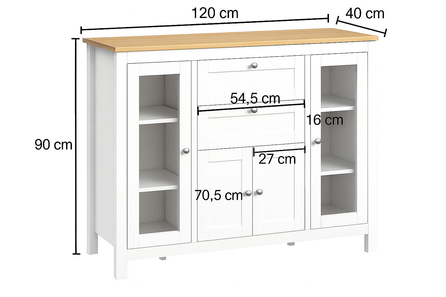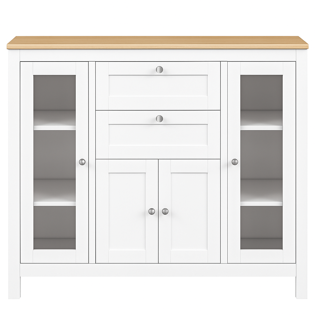 Actúa como mueble auxiliar de almacenamiento, ideal para organizar platos, fuentes, tazas, o incluso alimentos no perecederos. Los cajones superiores son perfectos para los utensilios de uso diario, mientras que las puertas de vidrio permiten visualizar fácilmente el contenido. Su superficie puede servir como estación de café, área de preparación o espacio adicional de apoyo.
