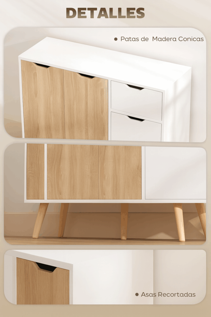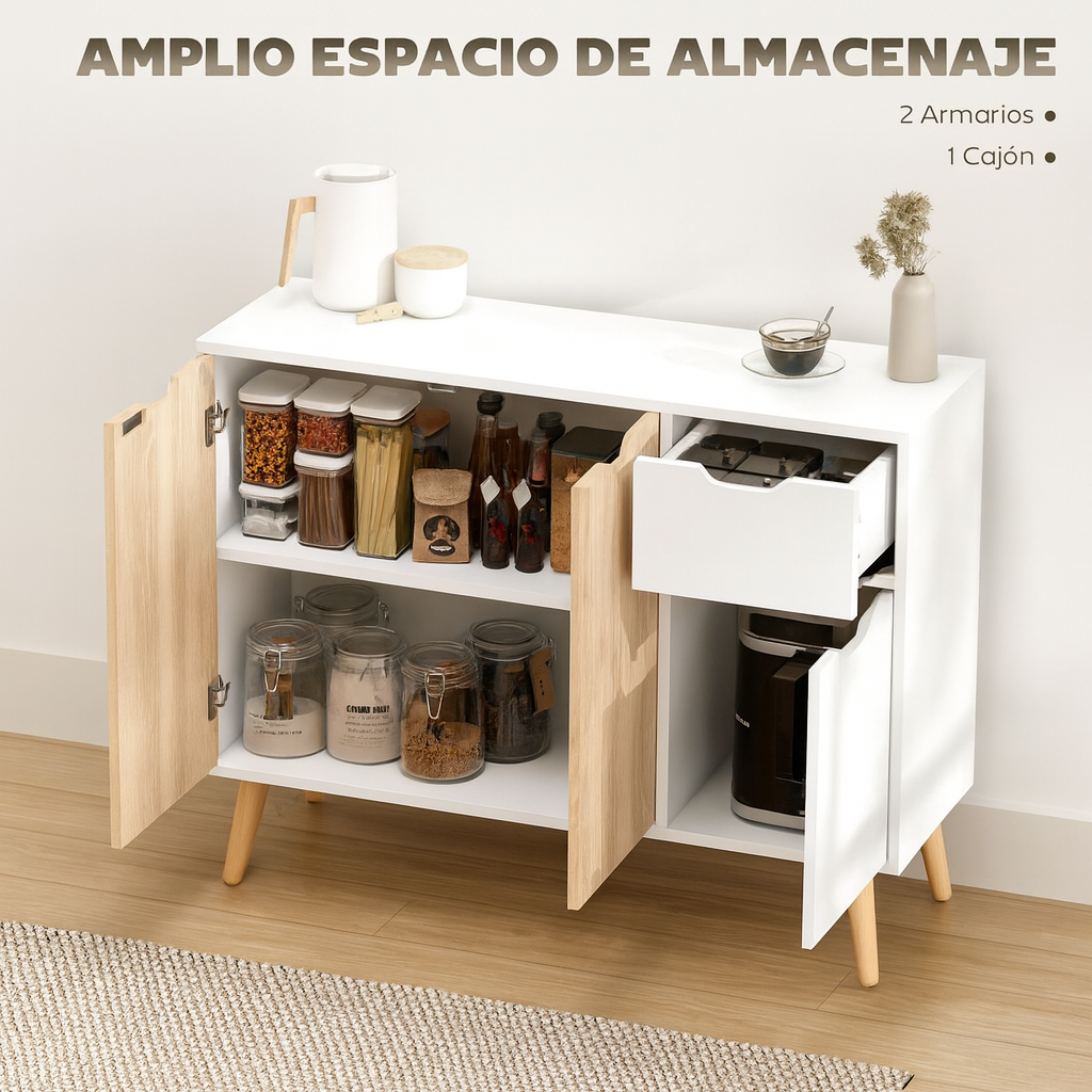 El HOMCOM Aparador Moderno con 3 puertas y 1 cajón se presenta como una opción elegante, práctica y contemporánea para quienes buscan maximizar el almacenamiento sin renunciar al estilo. Su combinación de colores —blanco y madera natural— evoca limpieza, luminosidad y equilibrio, adaptándose tanto a interiores escandinavos como a ambientes más minimalistas o nórdicos.