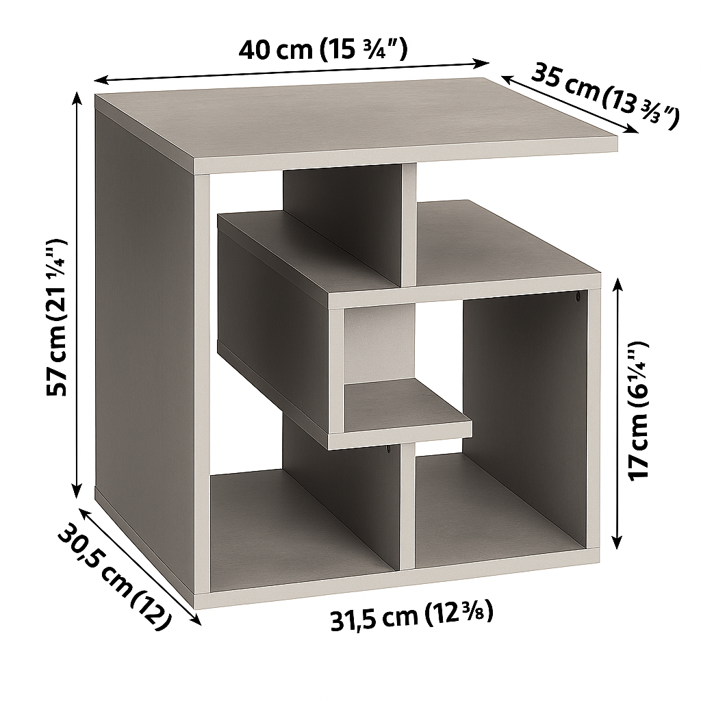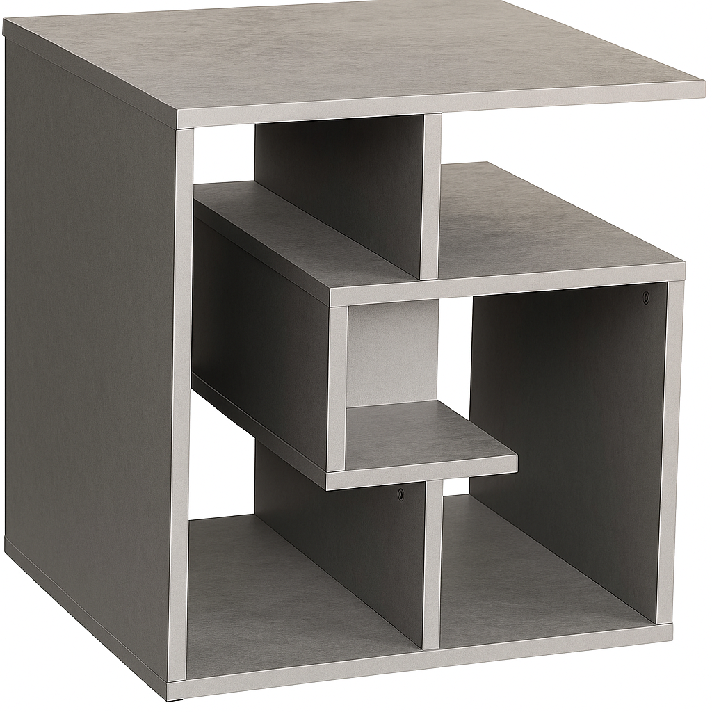 Su diseño compacto y geométrico, compuesto por líneas rectas y superficies en color gris cemento, transmite una sensación de modernidad minimalista. No es una mesa que pase desapercibida, ya que su estructura de tres niveles abiertos invita tanto al orden como a la creatividad decorativa. Este tipo de mueble está pensado para quienes buscan practicidad sin renunciar al diseño, siendo útil como mesa de centro pequeña, como mesa auxiliar en un salón, o incluso como organizador en dormitorios y despachos.