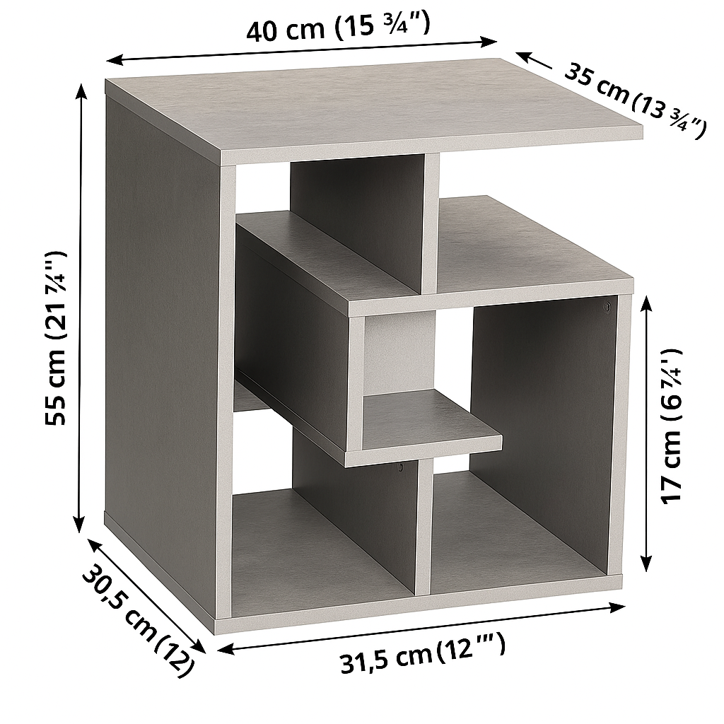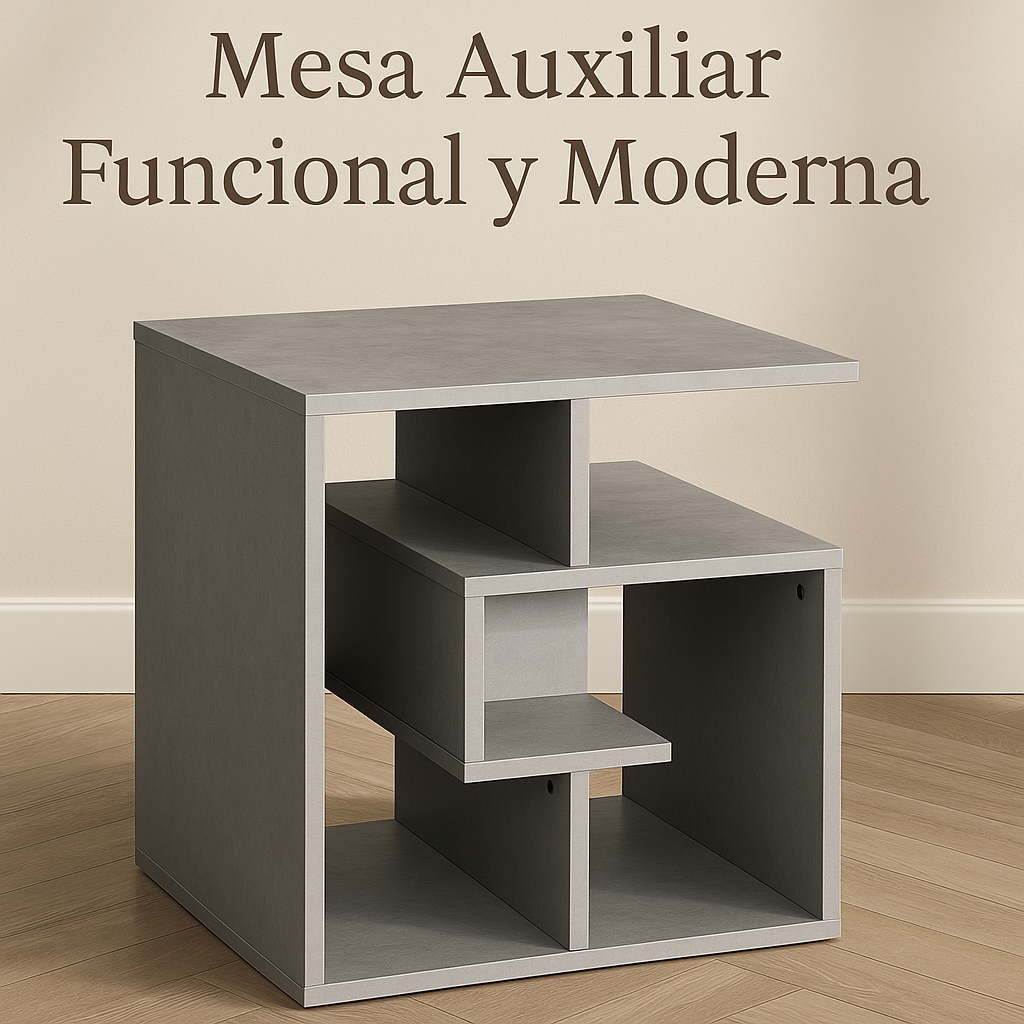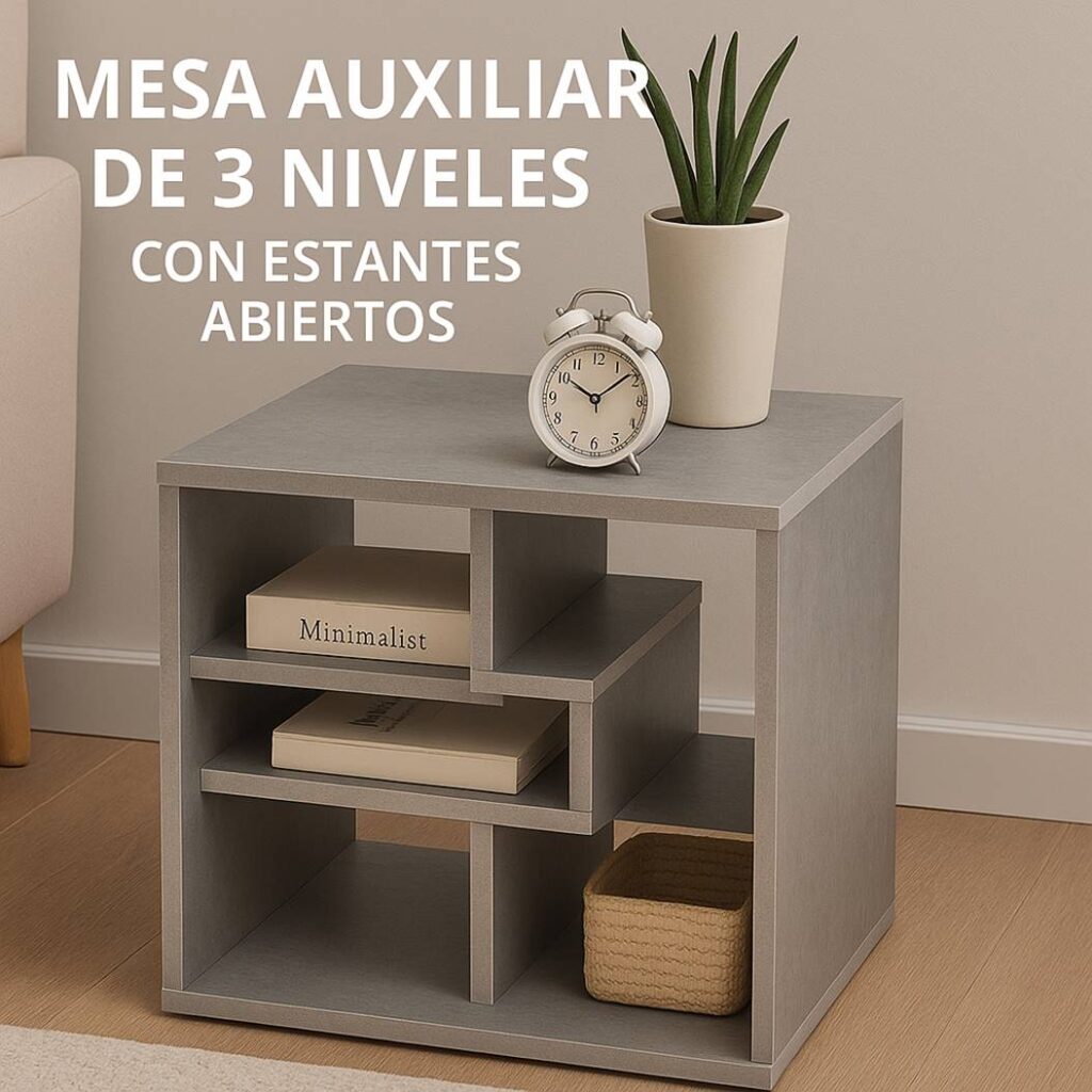 Su diseño compacto y geométrico, compuesto por líneas rectas y superficies en color gris cemento, transmite una sensación de modernidad minimalista. No es una mesa que pase desapercibida, ya que su estructura de tres niveles abiertos invita tanto al orden como a la creatividad decorativa. Este tipo de mueble está pensado para quienes buscan practicidad sin renunciar al diseño, siendo útil como mesa de centro pequeña, como mesa auxiliar en un salón, o incluso como organizador en dormitorios y despachos.