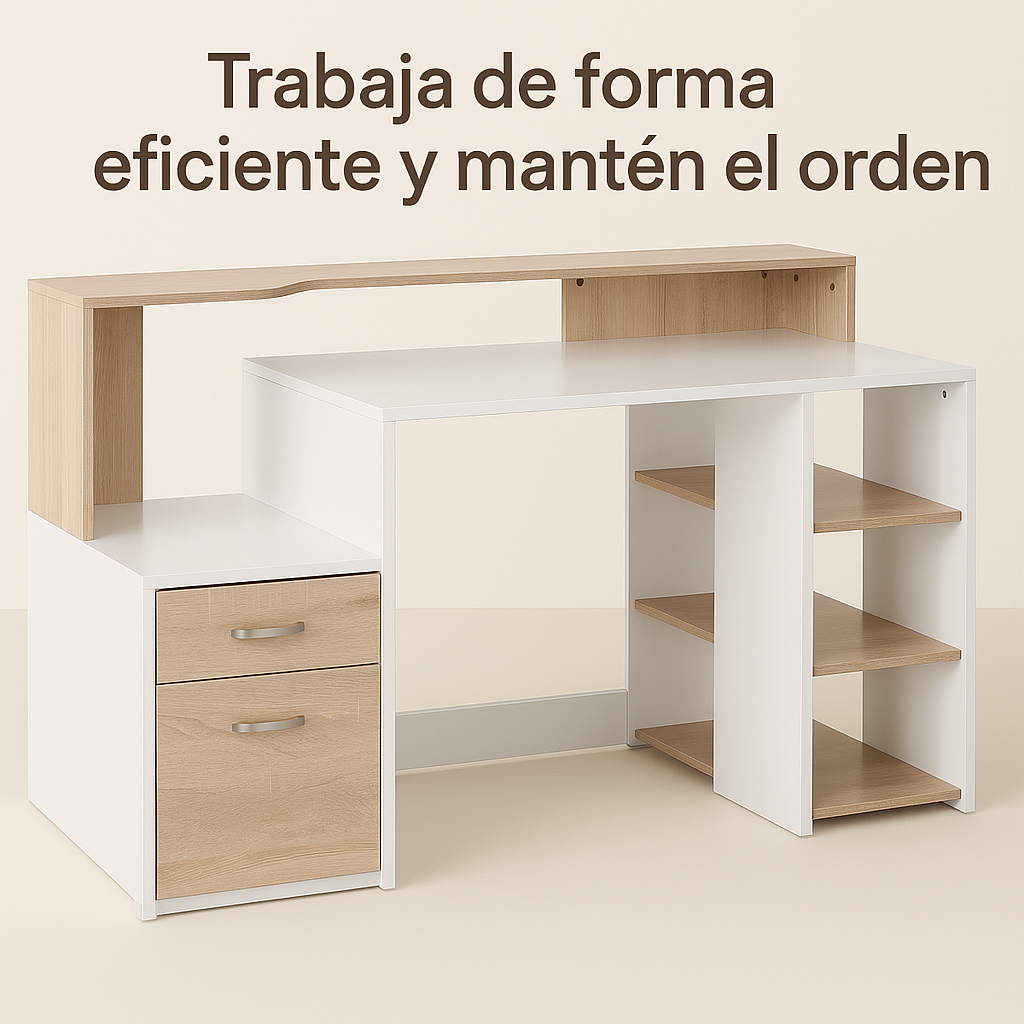 Este modelo en particular no es un simple escritorio plano donde apoyar el ordenador. Se trata de una estación de trabajo completa, concebida para responder a múltiples necesidades: almacenamiento, organización, ergonomía y estilo. Con su acabado en blanco y roble, aporta un aire moderno y elegante que encaja con facilidad en diferentes tipos de decoración, desde lo minimalista hasta lo más hogareño. Su estructura aprovecha cada centímetro disponible, integrando tres estantes abiertos, dos cajones y un espacio específico para la impresora, elementos que lo convierten en una opción altamente versátil.