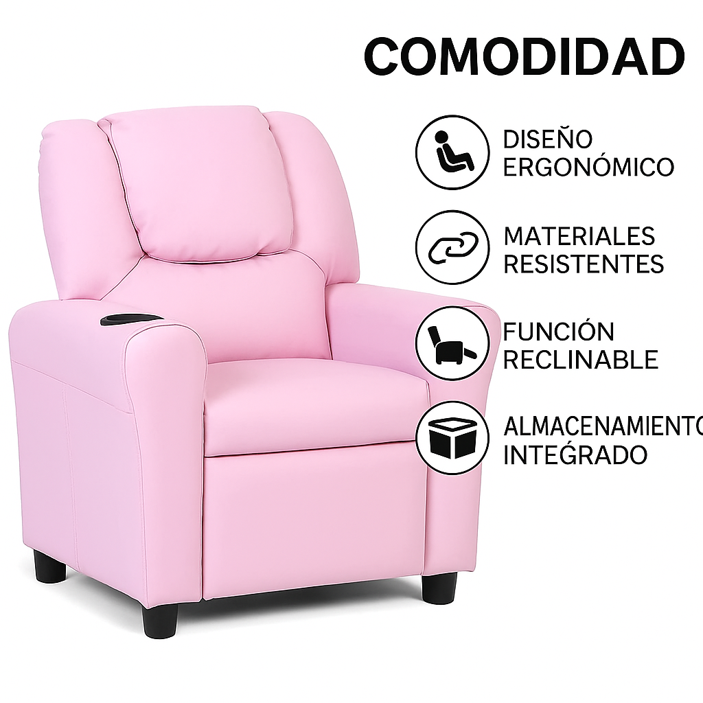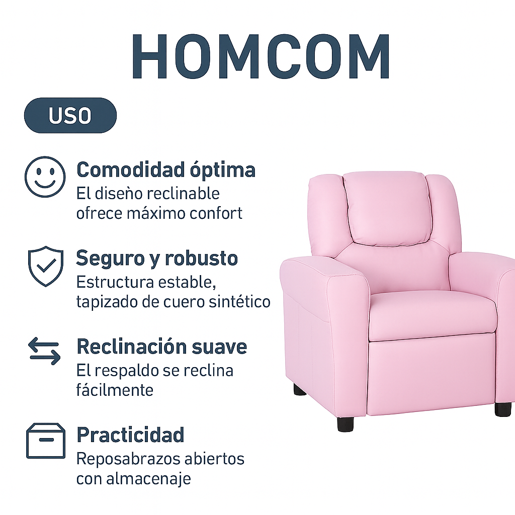 El sillón reclinable infantil de HOMCOM en color rosa combina diseño, confort y funcionalidad. Con su tapizado en polipiel fácil de limpiar, respaldo reclinable y reposabrazos acolchados, ofrece a los niños un espacio propio para leer, jugar, ver la televisión o descansar. Un mueble seguro, duradero y elegante que se adapta a cualquier rincón del hogar